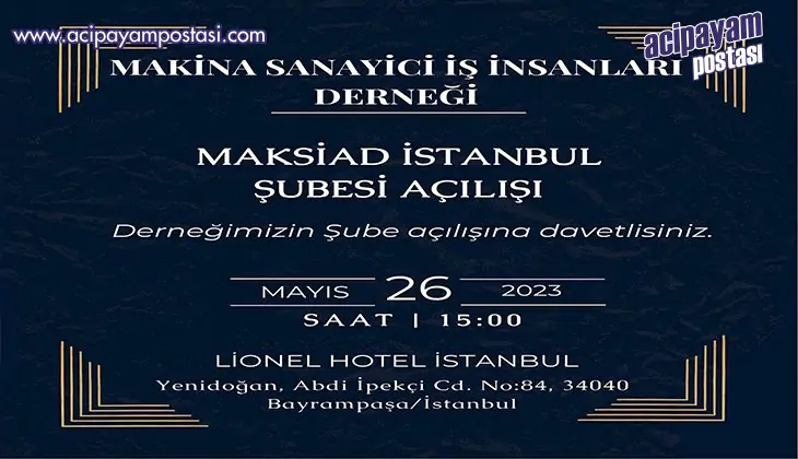 MAKSİAD’ın şube açılışı 26 Mayıs 2023 tarihinde saat:15:00 de LİONEL hotel İstanbul’da Yenidoğan Abdi İpekçi Cd. No:84 34040 Bayrampaşa İstanbul’da gerçekleşeceğini bildirdi.