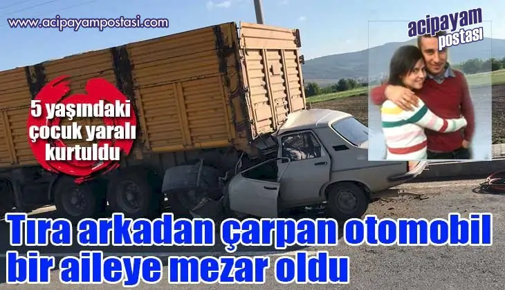 Kaza, Çivril ilçesine bağlı Kudret Çalık Bulvarı üzerinde meydana geldi. Edinilen bilgilere göre; Hüseyin Erten (28) idaresindeki 20 LV 048 plakalı otomobil, yol üzerinde park halinde olan 15 SE 473 plakalı tıra arkadan süratle çarptı. Çarpmanın etkisiyle araç tırın altına girdi. Diğer sürücülerin ihbarı üzerine bölgeye çok sayıda itfaiye ve sağlık ekipleri sevk edildi. Olay yerine giden sağlık görevlileri baba Hüseyin Erten ve yolcu konumundaki anne Yasemin Erten’in (25) hayatını kaybettiğini belirlerken, çiftin 5 yaşındaki oğlu Osman Erten’i yaralı olarak Çivril Devlet Hastanesi’ne kaldırdı. Araçta feci şekilde sıkışan çiftin cansız bedenleri itfaiye ekipleri tarafından çıkarılarak morga kaldırıldı.